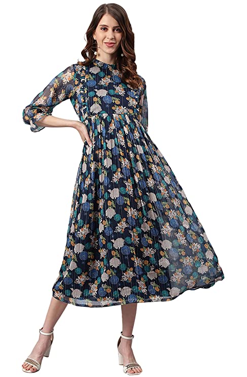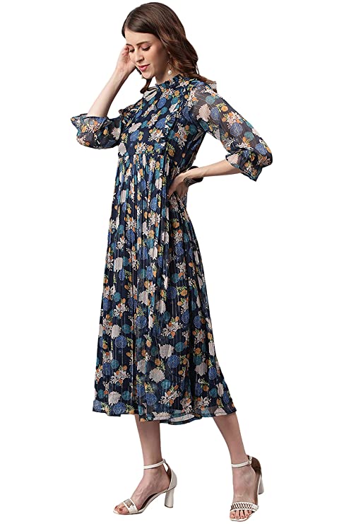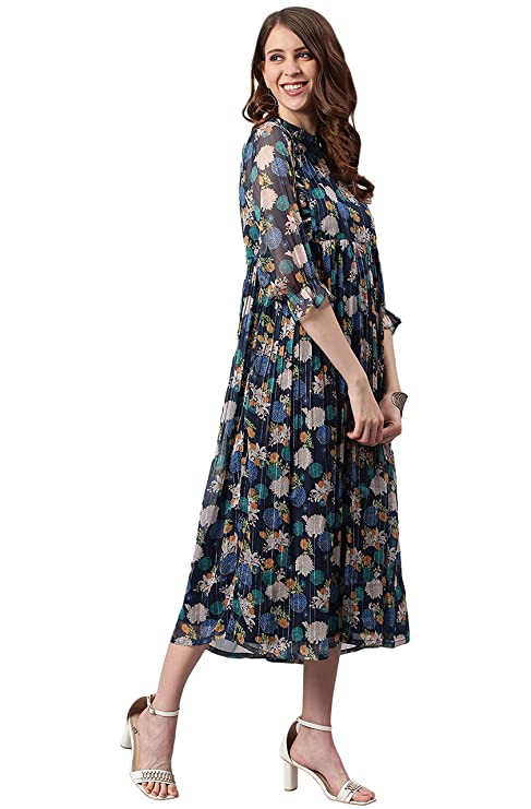 Premium Collection by Jana. This floral printed poly georgette dress from Jana will make a great addition to any wardrobe. With ruffles on high neck and princess line this flared dress has all the charm you need for getting that perfect look. When you need an outfit for work and dinner after work, wear this puff sleeve piece with platform heels and some minimalistic jewellery.