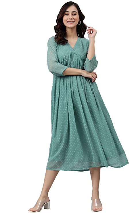Jana Women’s Turquoise Blue Poly Chiffon Self Design Flared Western Dress