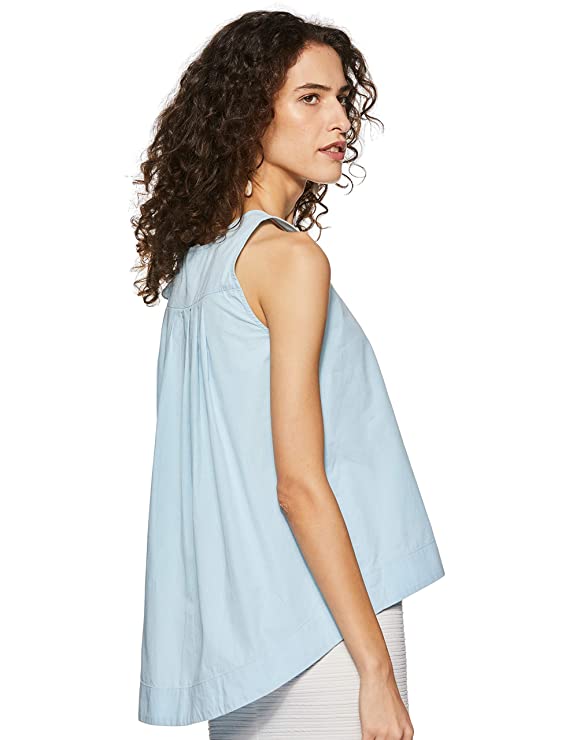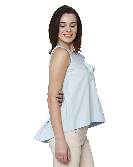 Kimiku Women Light Blue Solid U-Neck Sleeveless Regular Fit Cropped / Short Casual Wear High-Low Top