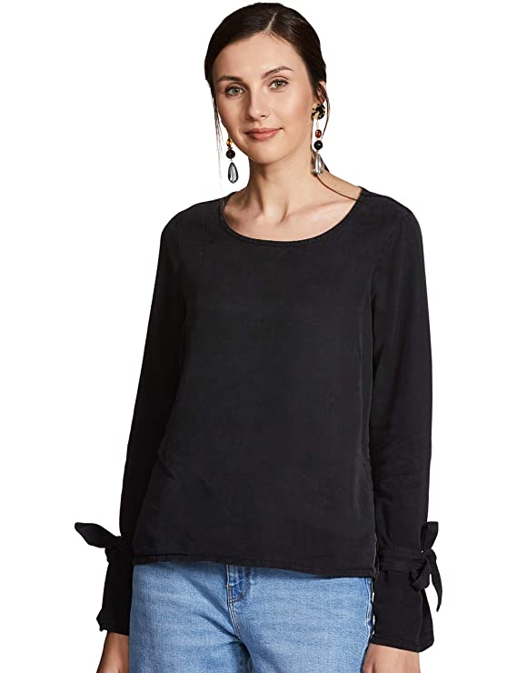 Kimiku Women Black Solid Long Sleeve Round Neck Top