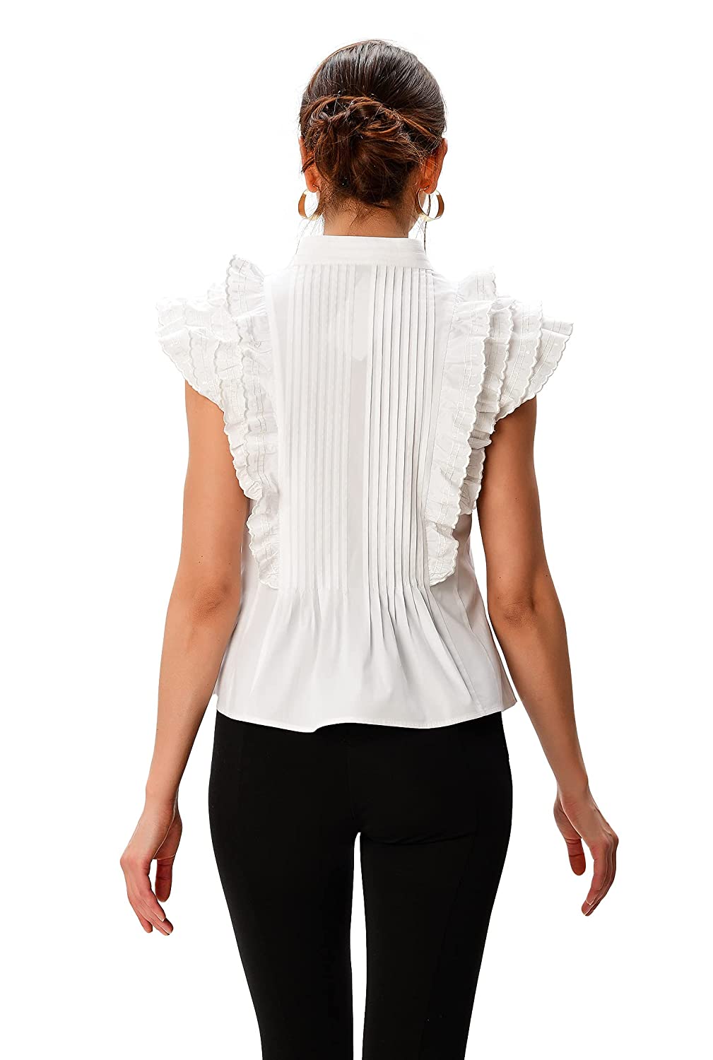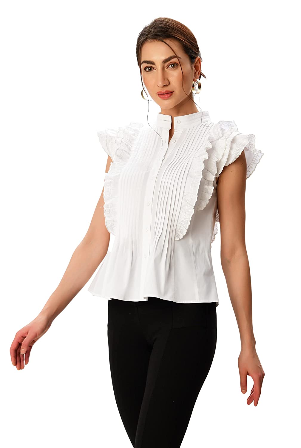 Banded collar. , Ruffle cap sleeves, scallop trim. , Above the hip length. , Front self-button closure. , Inner shoulder bra strap keeps. , 98% cotton/2% spandex, woven poplin, pre-shrunk, smooth finish, wrinkle-resistant, light stretch, midweight. , Machine wash cold. , Model is wearing our size S/4, cut for her height of 5’10”.